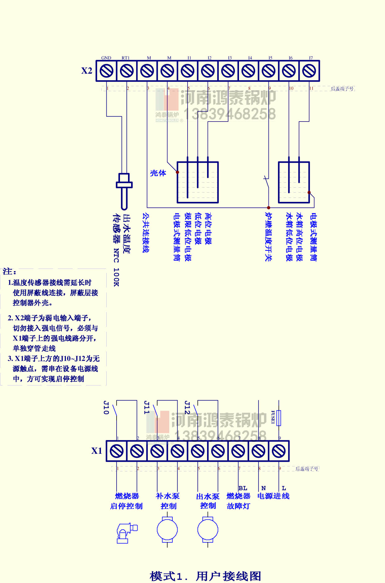 注:控制器第一次进入运行状态时,如果锅炉水位低于“高位电极”控制器开启水泵。当锅炉水位达到“高位电极”时,控制器关闭水泵。