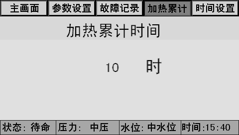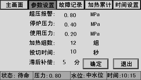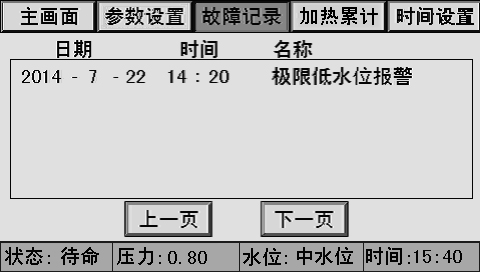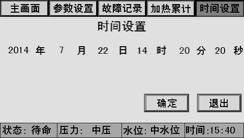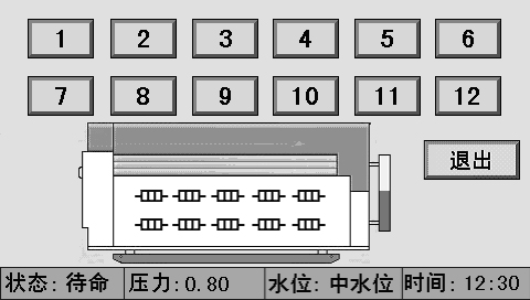 主画面上同时显示控制器状态、系统压力、水位、时间、燃烧器状态、泵状态等。