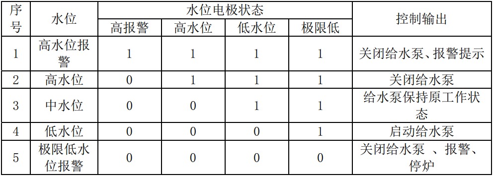 控制器通过检测水电极信号判断锅筒水位的状态,并根据此状态控制给水泵的启停,如下表所示: