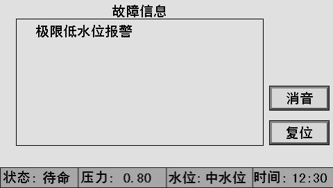 画面中间显示故障名称(可显示同时出现的多个故障),画面右侧有“消音”和“复位”两个按钮。按“消音”键可关闭报警输出继电器;按“复位”键回到主画面。如故障现象没有消除,系统 1 分钟后重新进入报警画面。故障排除后,按“复位”键,退出故障报警画面,返回待命状态。控制器检测到报警时,除弹出显示报警画面外,报警发生的时间和名称都被记录下来,可通过查阅报警记录,检查最近发生的 70 条报警记录。