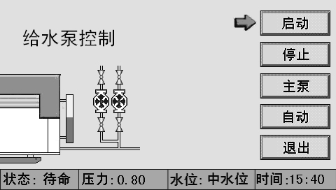 按“启动”按键,控制器启动给水泵,同时被置为手动状态。按“停止”按键,控制器关闭给水泵,同时被置为手动状态。按“主泵/备泵”按键,给水泵原为主泵就切换到备泵,同时该按键变为“备泵”;原为备泵就切换到主泵,同时该按键变为“主泵”。按“手动/自动”按键,给水泵原为手动状态就转变为自动状态,同时该按键变为“自动”;原为自动状态就转变为手动状态,同时该按键变为“手动”。按“退出”按键,退回到主画面。